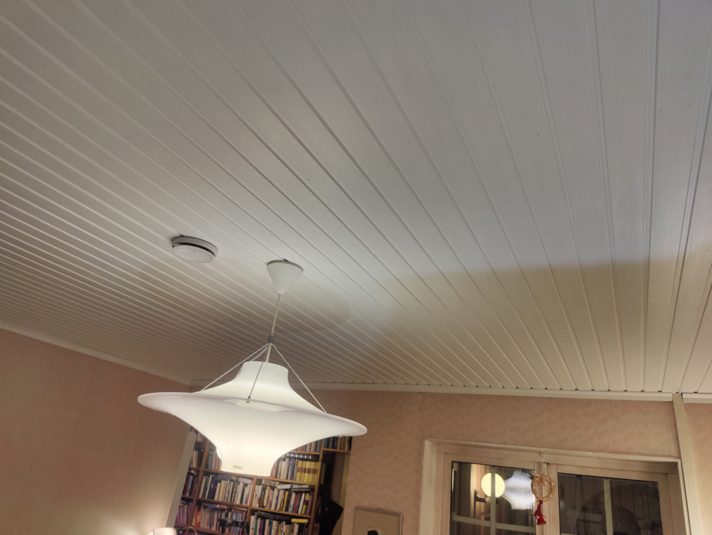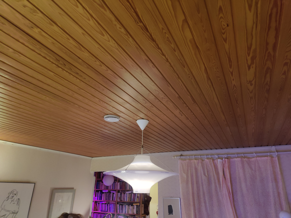 Alunperin vaalea puupaneelikatto tummuu vuosien myötä ...